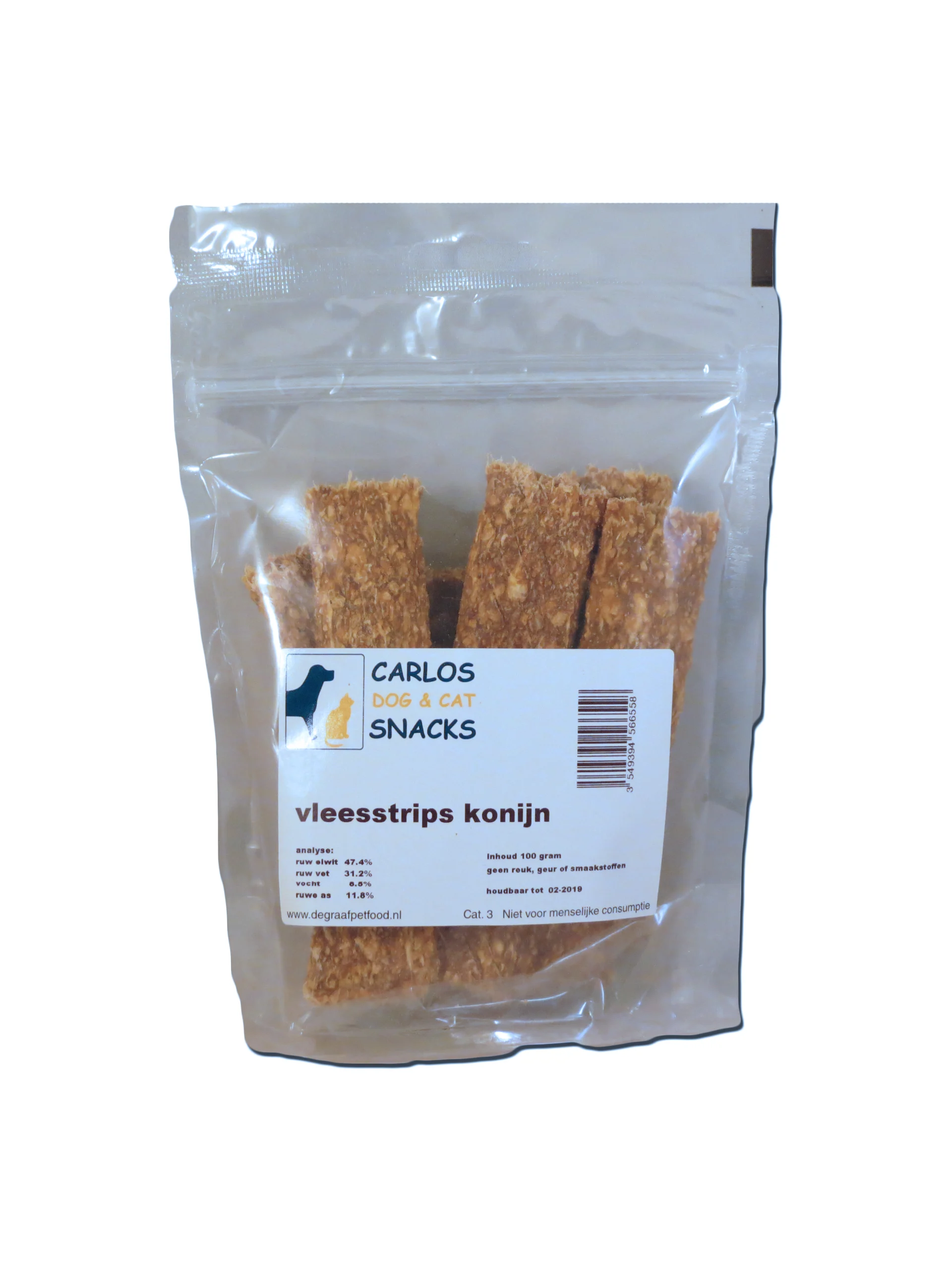 Een heerlijke Carlos Vleesstrips Konijn voor uw hond. Makkelijk in kleine stukjes te geven en te gebruiken bij de training.