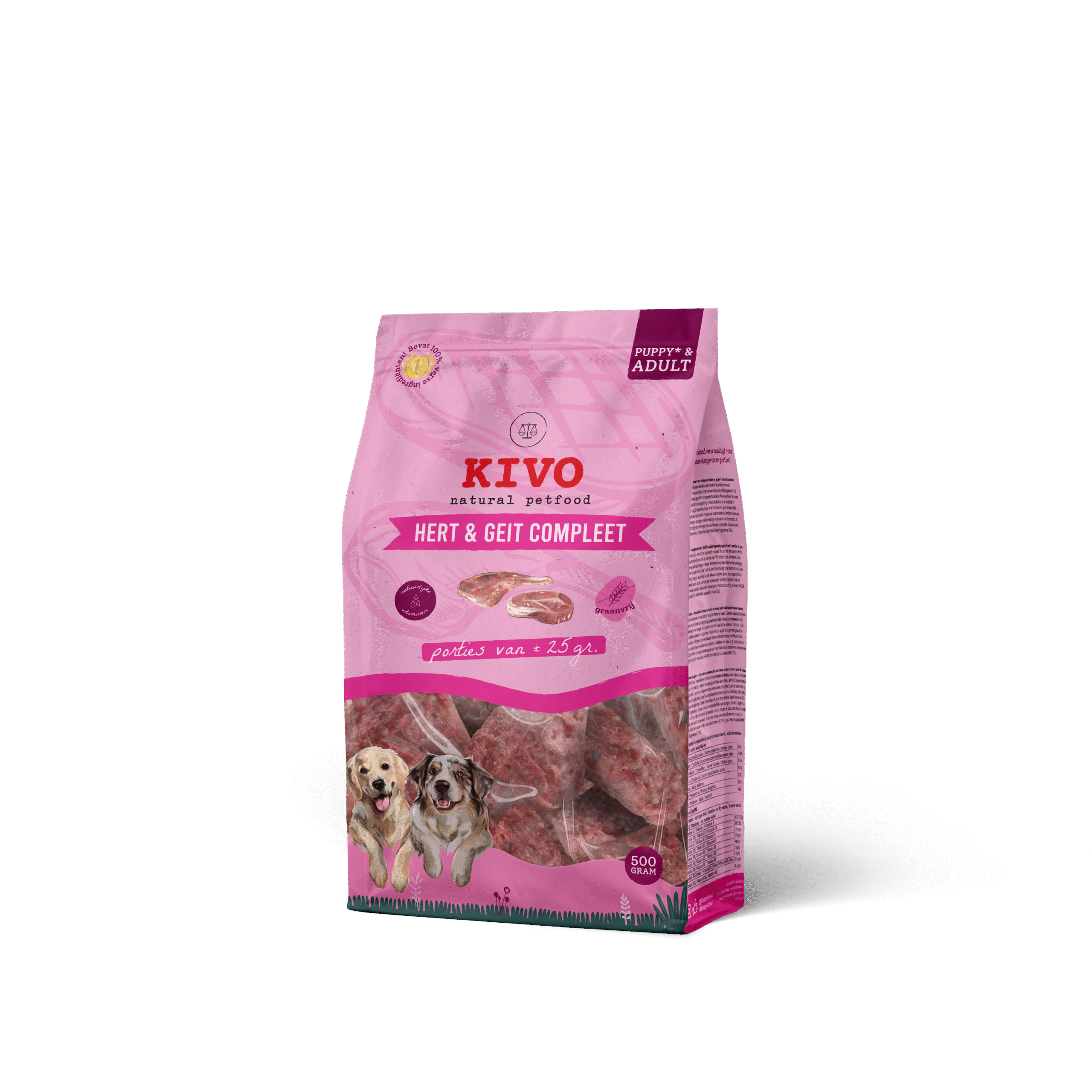 Diepgevroren vers vlees verpakt in blokjes van 25 gram in een zak van 500 gram. Al het vlees wat in Kivo producten verwerkt wordt, is afkomstig van vlees geschikt voor humane consumptie. Deze maaltijd is ook geschikt voor pups vanaf 4 maanden!