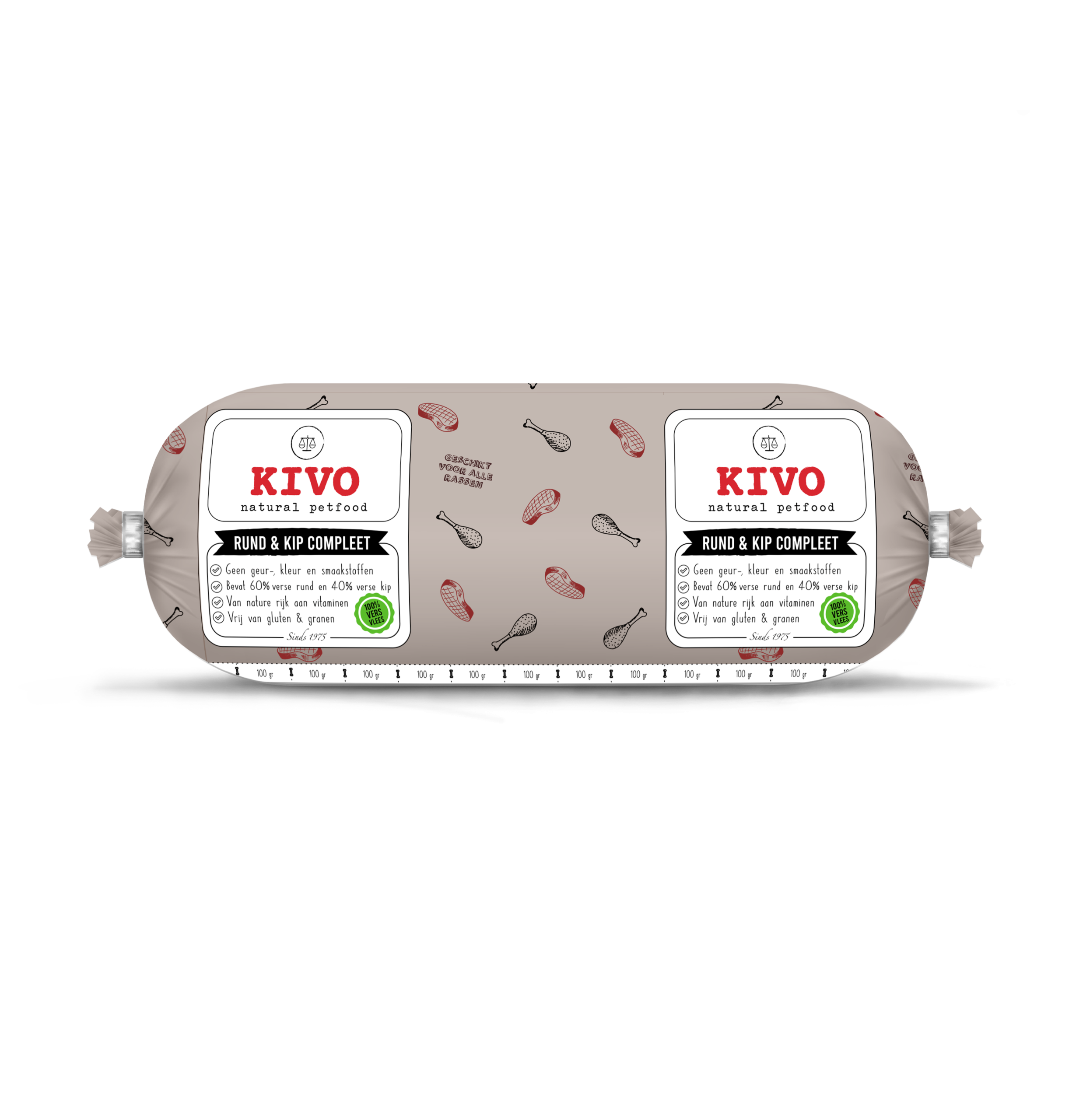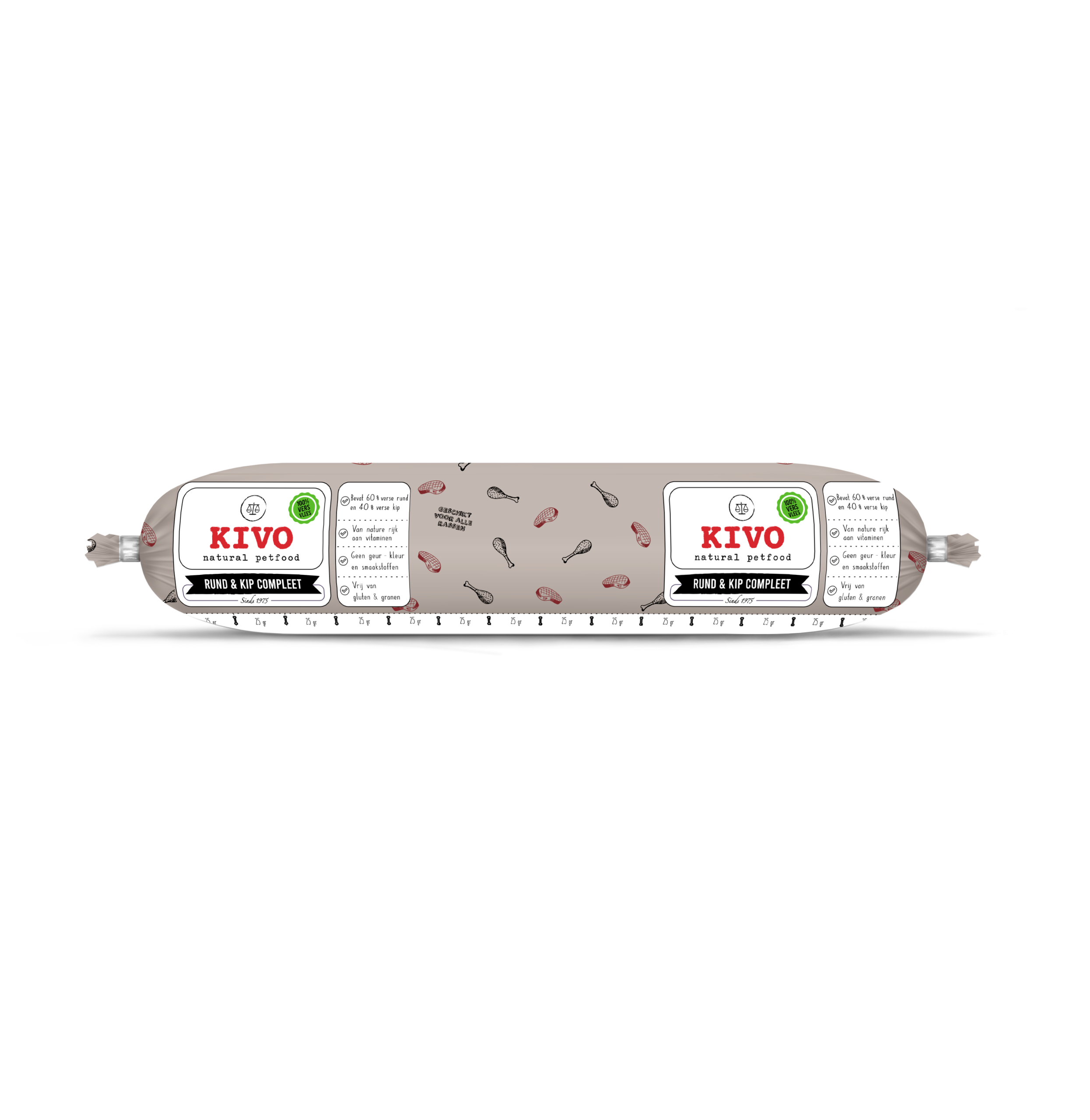 Diepgevroren vers vlees verpakt per rol of in een doos. Al het vlees wat in Kivo producten verwerkt wordt, is afkomstig van vlees geschikt voor humane consumptie. Verkrijgbaar in dozen van 10 x 1 kg en 20 x 500 gram of los verpakt.